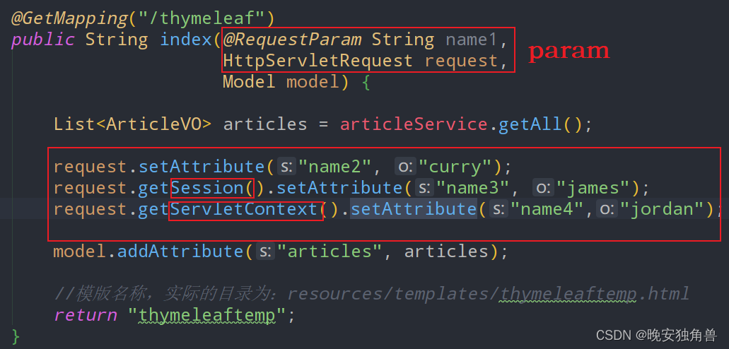 model.addAttribute("articles", articles);//模版名称,实际的目录为:resources/templates/thymeleaftemp.htmlreturn"thymeleaftemp";}
