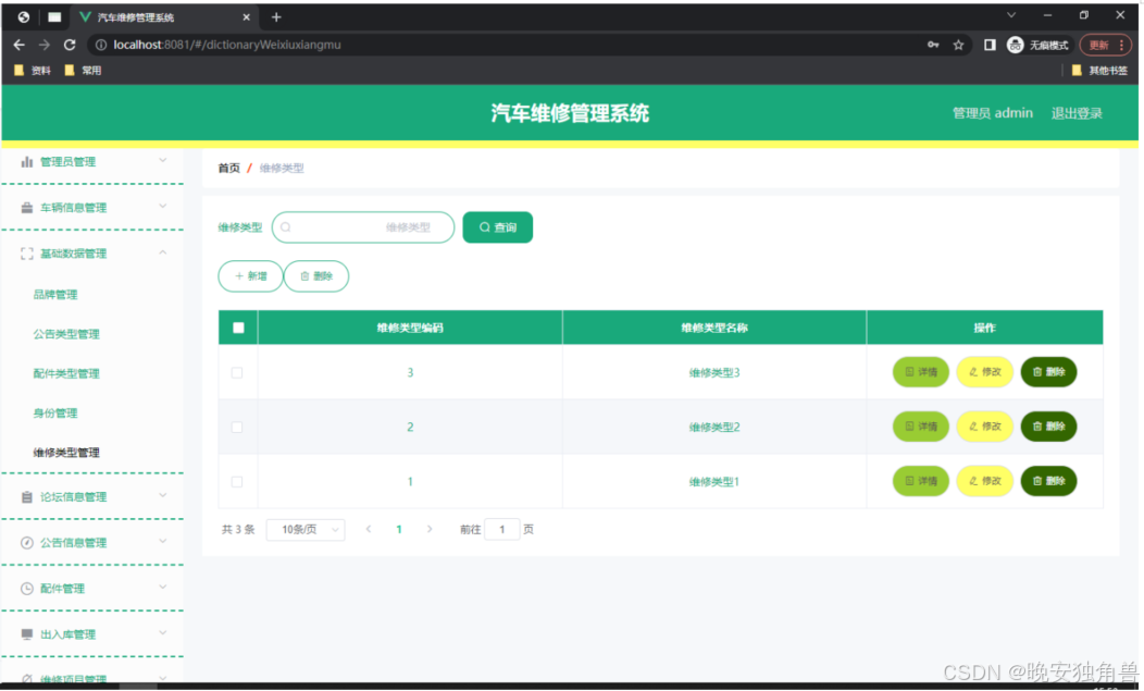 如图5.3显示的就是维修项目类型管理页面,此页面提供给管理员的功能有:根据维修项目类型进行条件查询,还可以对维修项目类型进行新增、修改、查询操作等等