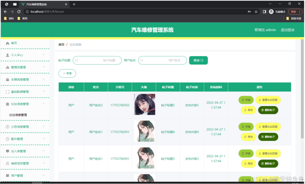 如图5.4显示的就是论坛信息管理页面,此页面提供给管理员的功能有:根据论坛信息进行新增、修改、查询操作等等。