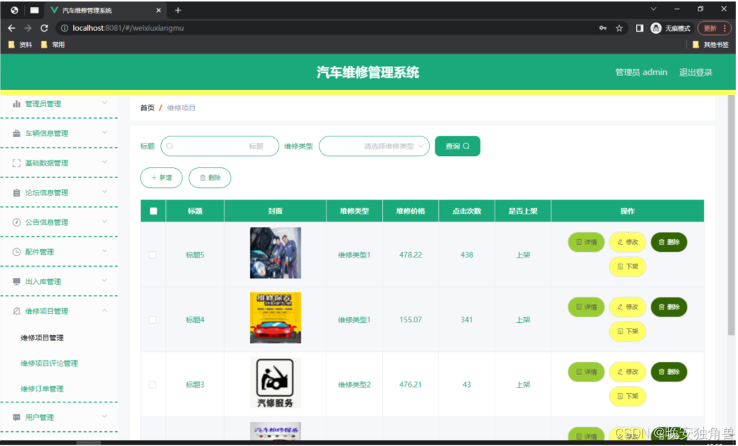 汽车维修项目管理系统使用Java语言进行编码,使用Mysql创建数据表保存本系统产生的数据。系统可以提供信息显示和相应服务,其管理汽车维修项目管理系统信息,查看汽车维修项目管理系统信息,管理汽车维修项目管理系统。