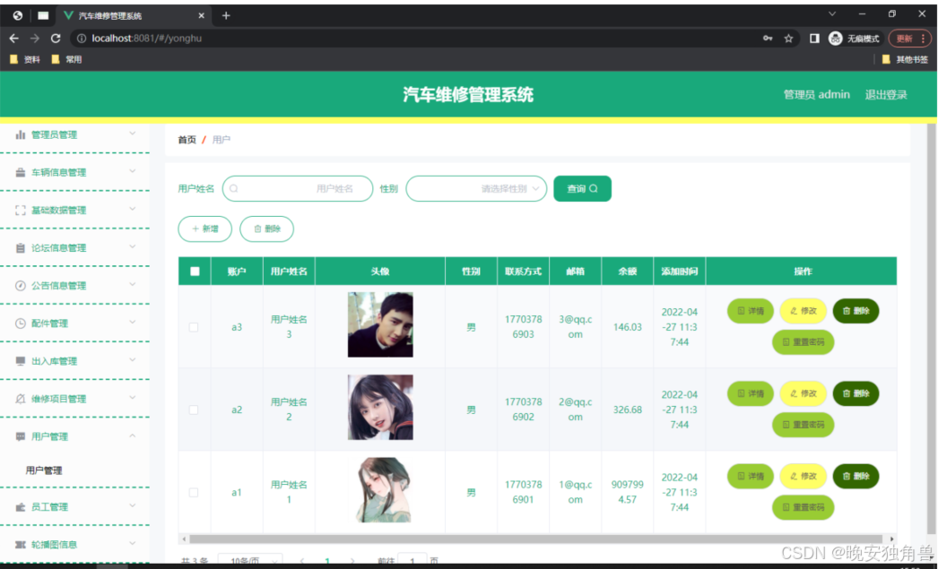 如图5.1显示的就是用户信息管理页面,此页面提供给管理员的功能有:用户信息的查询管理,可以删除用户信息、修改用户信息、新增用户信息,