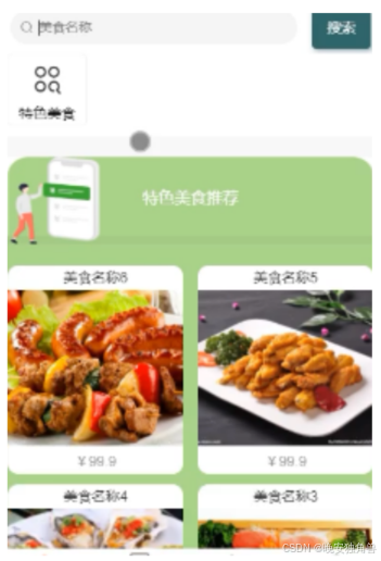 用户可以浏览美食信息,也可以根据美食的名称进行搜索,美食信息可以看到图片和价格,特色美食信息的实现界面如下图5.5所示: