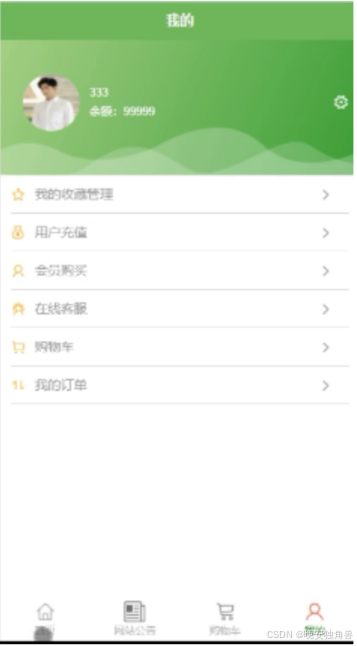 在我的功能里,用户可以管理订单信息,进行在线充值以及咨询客服和管理购物车信息。我的功能实现界面如下图5.8所示: