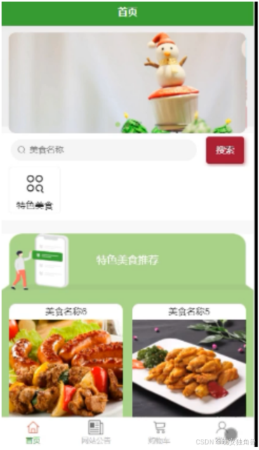 用户登录后可进入首页,在首页里可以看到公告信息和美食信息,可以进行美食搜索和进入购物车、我的界面。首页功能的实现界面如下图5.3所示: