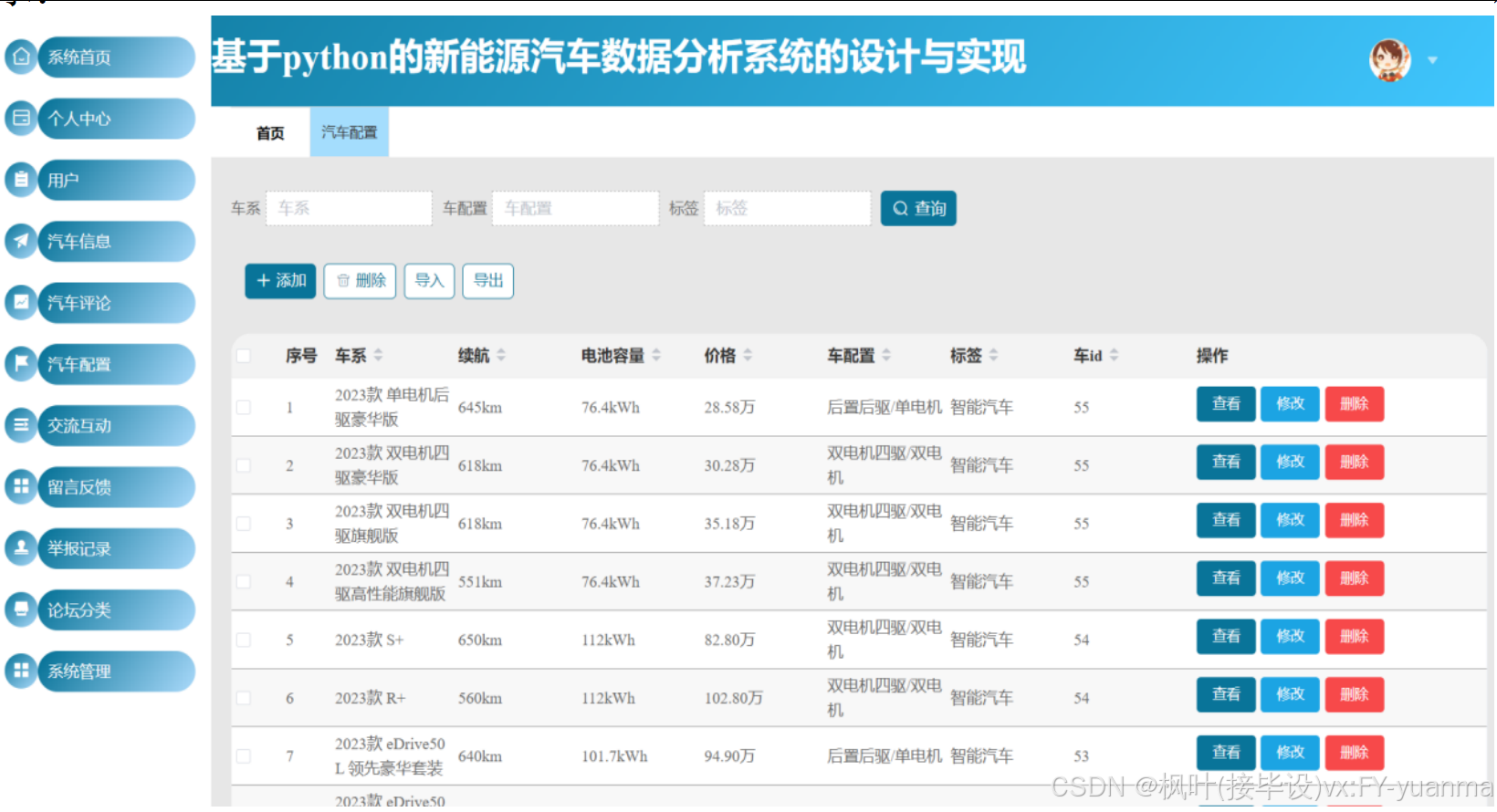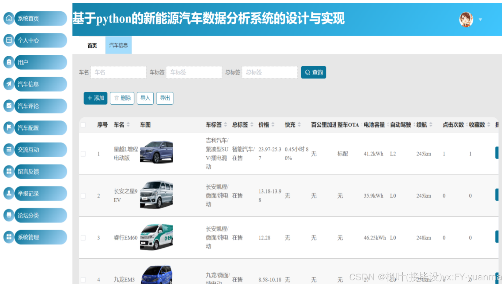 随着新能源汽车产业的蓬勃发展,海量相关数据不断产生,对这些数据进行有效分析对行业决策、产品研发等至关重要。本系统基于Python语言设计并实现了一套新能源汽车数据分析系统。系统采用Python的多种数据分析库与工具,如Pandas进行数据清洗与预处理,Matplotlib、Seaborn等实现数据可视化,Scikit-learn用于构建数据分析模型。在功能上,系统首先对新能源汽车的多源数据进行整合,涵盖车辆运行数据、用户充电数据、市场销售数据等。接着进行深入的数据分析,包括车辆能耗特征分析、充电行为模式挖掘、市场销售趋势预测等。通过可视化展示,直观呈现数据分析结果,帮助用户快速理解数据内涵。同时,利用机器学习算法构建预测模型,为新能源汽车的续航优化、充电设施布局规划以及市场策略制定提供科学依据。该系统为新能源汽车行业相关人员提供了一个高效、便捷的数据分析平台,有助于推动新能源汽车产业的智能化发展,提升行业决策的科学性与精准性。