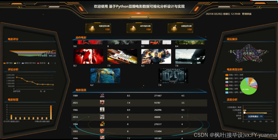 在电影数据繁杂且难以有效利用的背景下,本研究旨在搭建豆瓣电影数据可视化分析体系。该系统功能涵盖数据采集、处理、分析与展示,通过Python爬虫技术采集数据,运用Pandas库处理数据,借助Matplotlib、Seaborn等库实现数据可视化。系统采用分层架构设计,保障高效运行与可扩展性。经测试,系统稳定可靠,能为电影爱好者提供精准影片推荐,帮助其提升观影体验;为电影行业从业者在影片制作、发行、营销等方面提供数据支撑,助力行业精细化运营;为学术研究提供数据资源与研究思路,推动电影相关学科发展。总之,该系统在多领域具有重要应用价值,有效解决了电影数据利用难题。