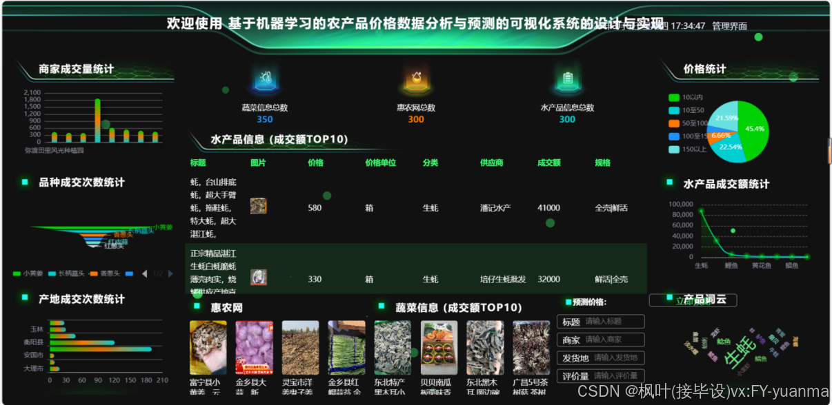 随着农产品市场的不断发展,价格波动成为影响农民收入和市场稳定的重要因素。系统采用Scrapy框架进行数据采集,从惠农网等平台抓取蔬菜、水产品等农产品的价格信息,并利用Spark进行高效数据处理与分析。通过Python语言结合机器学习算法,实现对农产品价格的精准预测。系统前端基于Django框架构建,提供用户友好的交互界面,后端采用MySQL数据库存储数据,确保信息的安全与高效检索。用户可通过系统实时查看农产品价格走势,管理个人账号信息,并进行价格预测查询,为农业生产与销售提供有力支持。