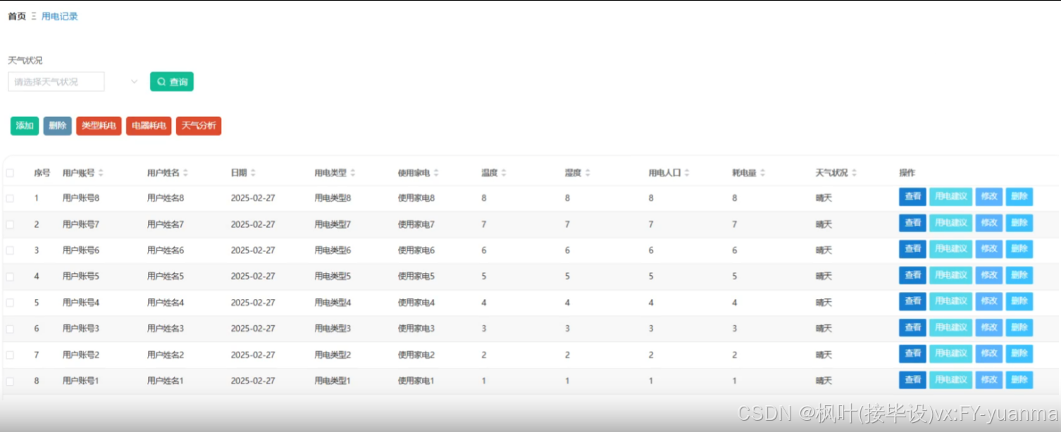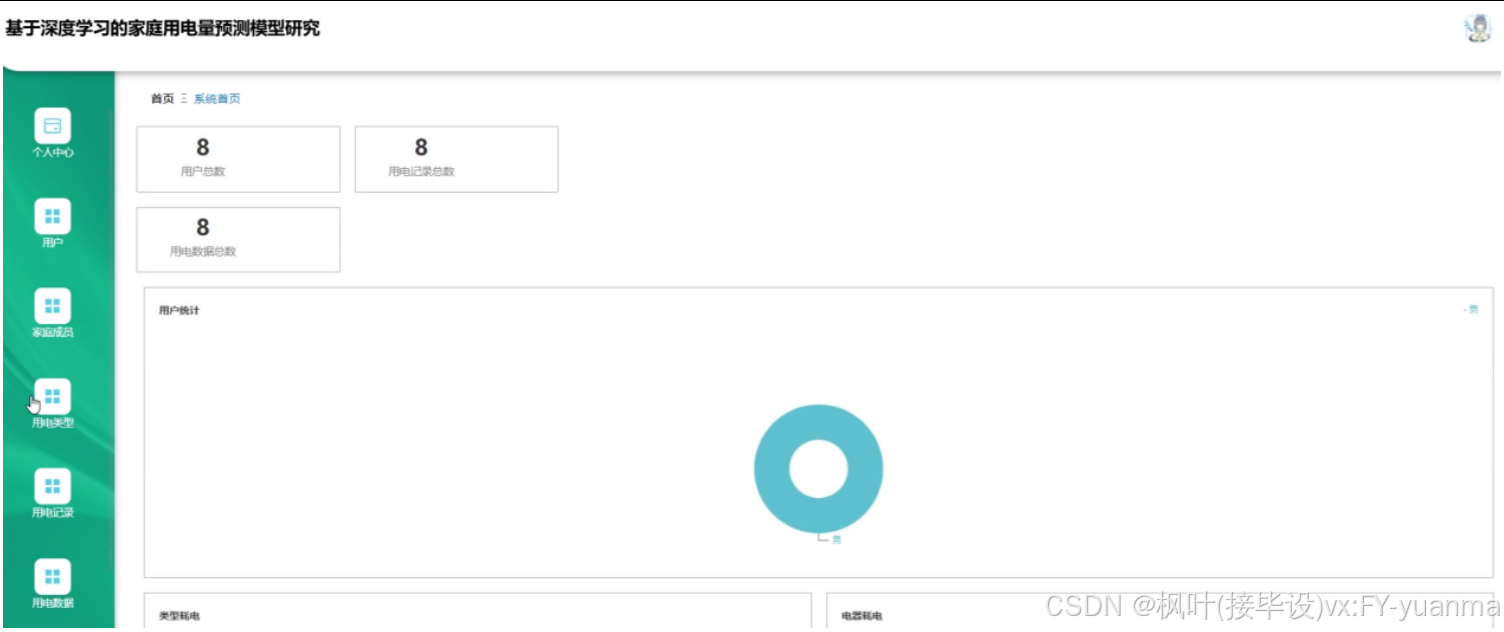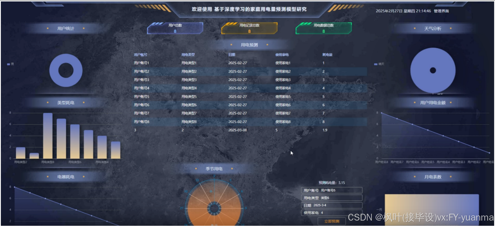 随着家庭用电需求的日益增长,精准预测用电量对于能源管理与成本控制具有重要意义。本文介绍了一种基于深度学习的家庭用电量预测系统,旨在为用户提供高效、智能的用电管理解决方案。系统采用 Python 语言开发,结合 Django 框架实现高性能的后端服务,并利用 MySQL 数据库存储用户数据、用电记录及预测模型参数等信息。功能模块涵盖个人中心、用户管理、家庭成员信息维护、多种用电类型分类、详细的用电记录查询、用电数据分析、个性化的用电建议以及核心的用电预测功能。通过深度学习算法对历史用电数据进行学习和建模,系统能够准确预测未来用电趋势,帮助用户优化用电行为,降低能源消耗。系统管理模块提供权限控制、数据备份与恢复等功能,确保系统的稳定运行。该系统不仅提升了家庭用电管理的智能化水平,也为节能减排提供了有力支持。