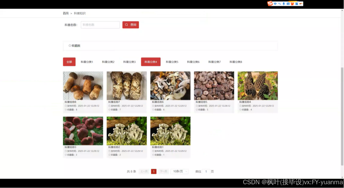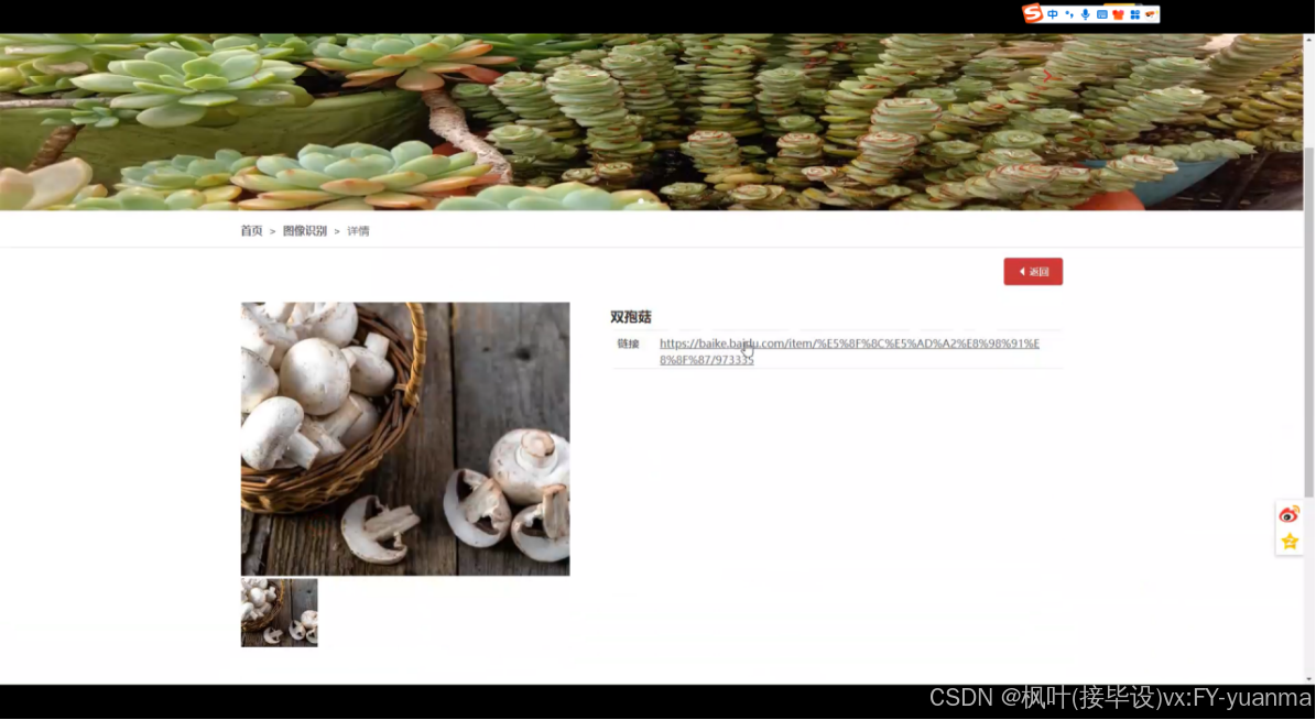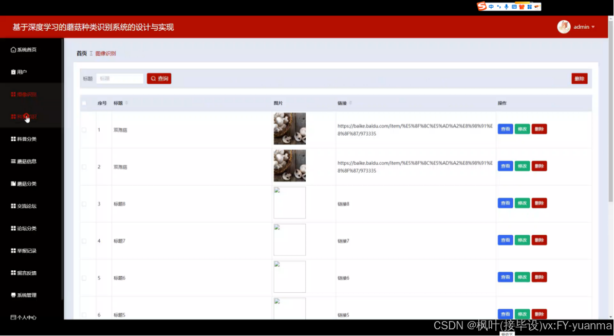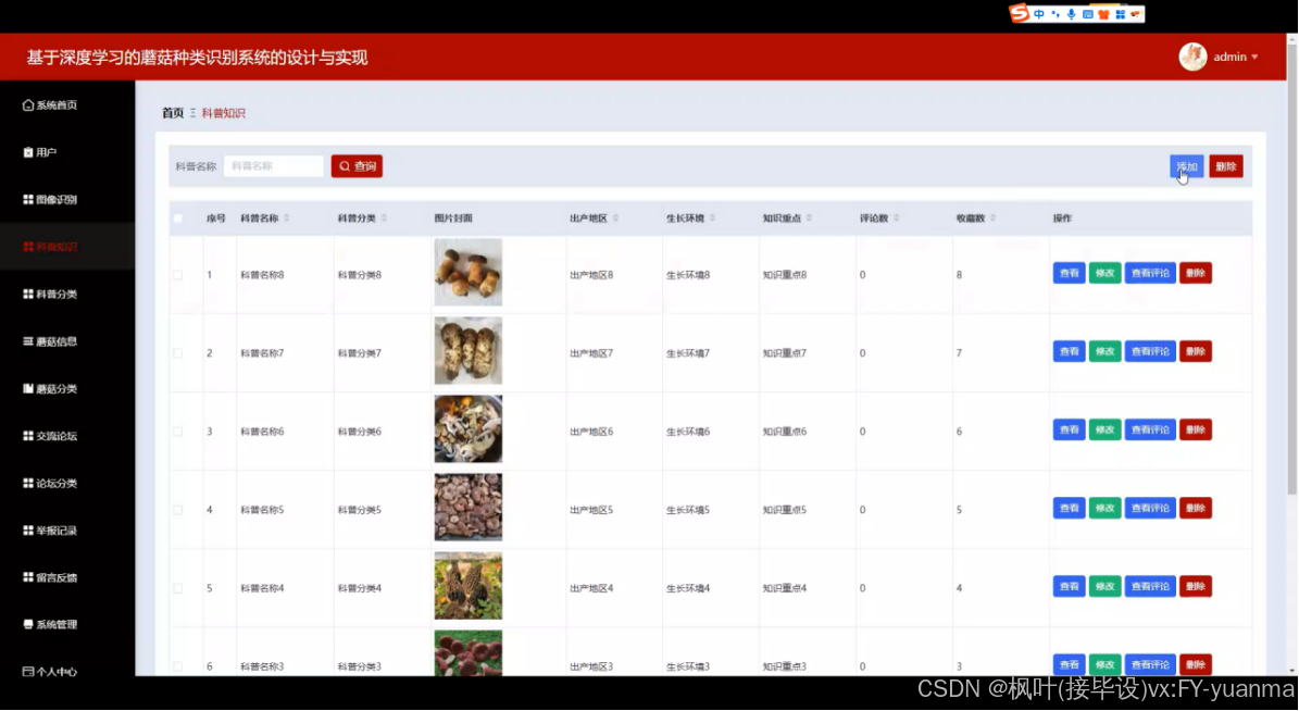 本论文旨在设计并实现一个基于深度学习的蘑菇种类识别系统,以应对野生蘑菇种类繁多、易因误认导致食用风险的问题。系统具备丰富功能,面向用户,提供科普知识帮助了解蘑菇特性,涵盖各类蘑菇信息以供查询,交流论坛方便用户分享经验,通知公告及时传递重要消息,注册登录保障用户账号安全,留言反馈渠道收集用户意见,核心的图像识别功能借助深度学习算法,能快速准确识别蘑菇种类并展示详细信息。对于管理员,可对图像识别内容、科普知识、蘑菇信息、交流论坛、通知公告、留言反馈及用户进行全面管理。系统开发采用BS架构确保便捷访问,依托MySQL数据库存储数据,运用Java技术搭建框架,借助深度学习算法完成核心识别任务。经测试,系统在功能实现、性能表现上达到预期,有效提升蘑菇种类识别效率与准确性,为用户提供可靠的蘑菇识别服务,在保障食品安全、促进菌类研究等方面具有积极意义。