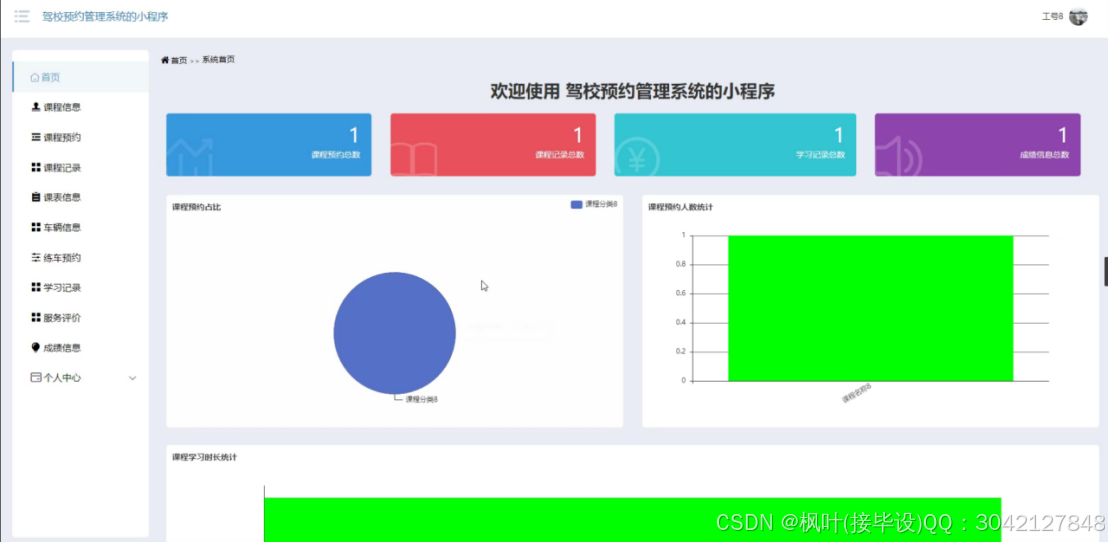 在小程序端,用户可以直观地浏览课程信息、车辆状态以及实时天气情况,帮助他们更好地规划练车时间。个人中心模块则涵盖了从个人资料设置到课程预约、学习记录等一系列功能,让学员能够轻松管理自己的学习进度。通知消息和成绩信息的即时更新,确保学员不错过任何重要信息。