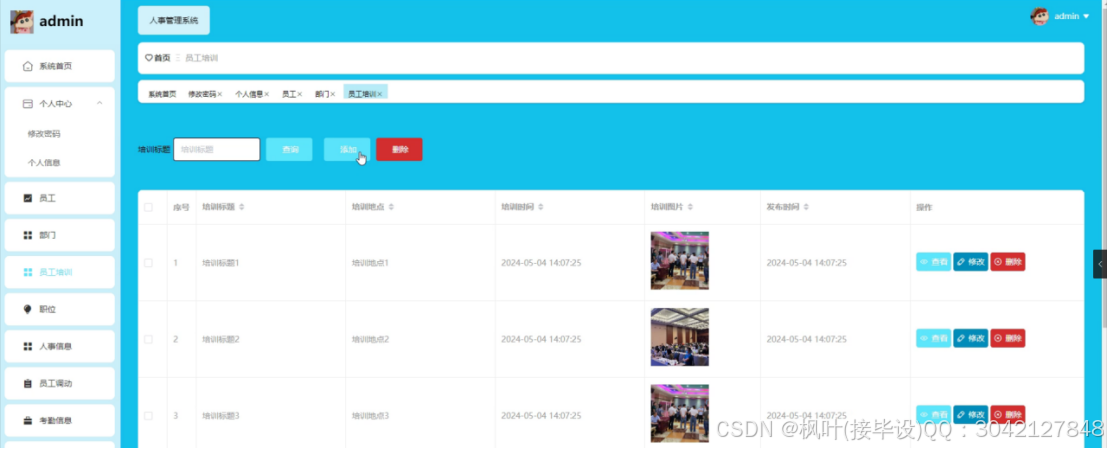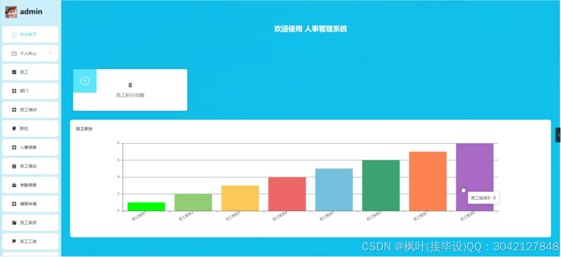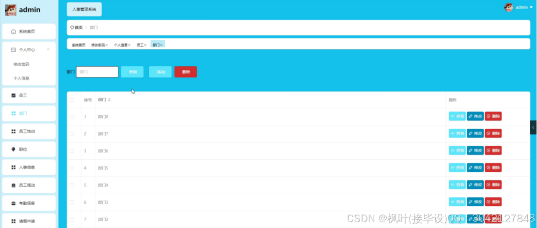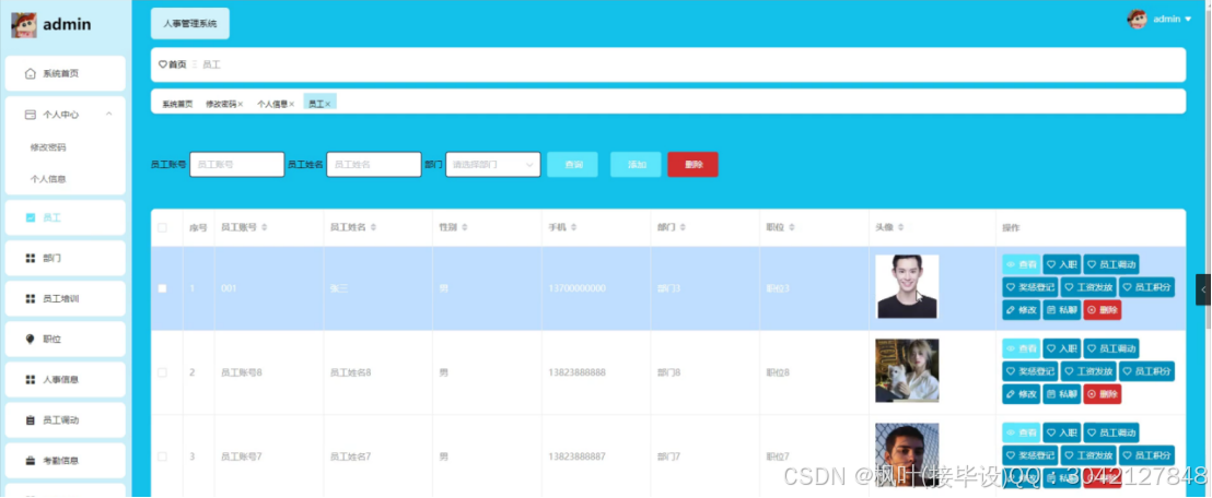人事管理系统是企业用以维护员工信息、管理人力资源活动和优化组织效能的关键工具。该系统具备多项功能,包括员工信息管理、部门协调、培训安排、职位调整、考勤追踪、请假审批、奖惩记录、工资发放以及员工积分管理等。管理员端提供全面控制,允许系统管理员执行从数据输入到系统设置的各项操作。前台则专为员工设计,让员工能够查看个人信息、参与培训、查阅通知公告,并在个人中心内管理各项与自身相关的数据。通过这一平台,企业可以有效监控人员动态,确保人事政策得到恰当执行,同时为员工提供一个透明且便捷的自我管理环境。整体而言,人事管理系统对于提升企业人事行政效率和员工满意度起着至关重要的作用。最终,对基本系统开展了检测,包含系统功能测试、还对测试进行分析;测试分析结果表明,该系统能够实现所需的功能,运行状况尚可并无明显缺点。