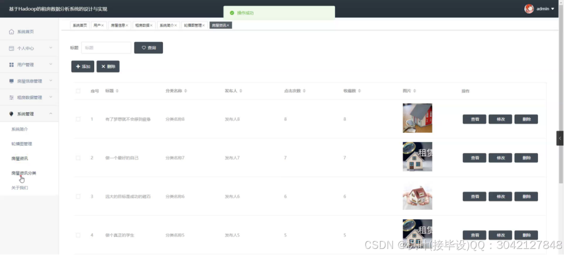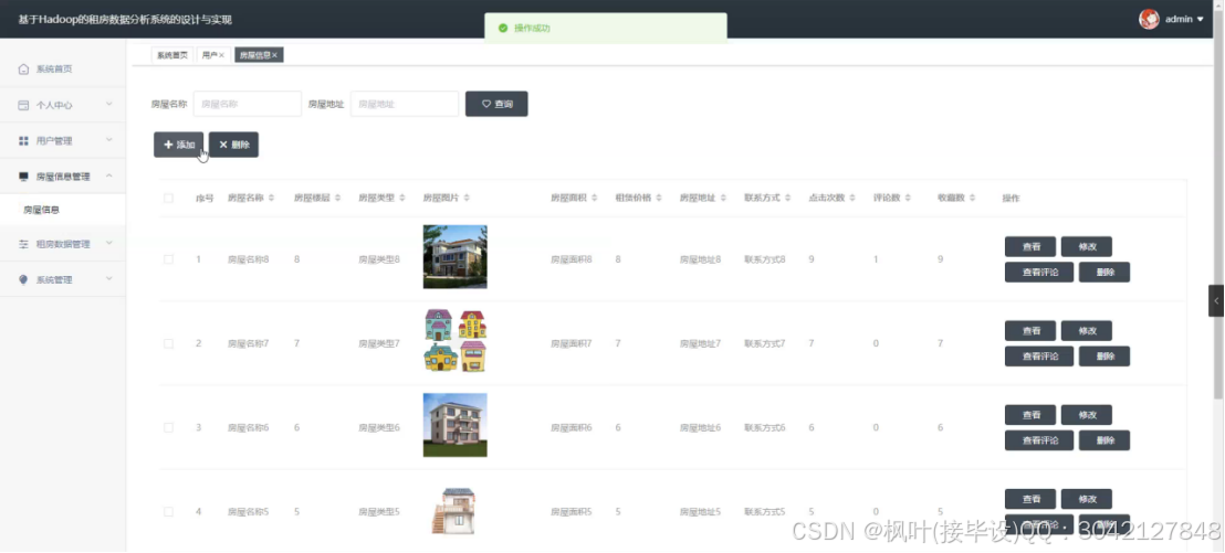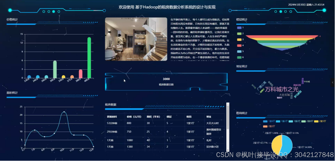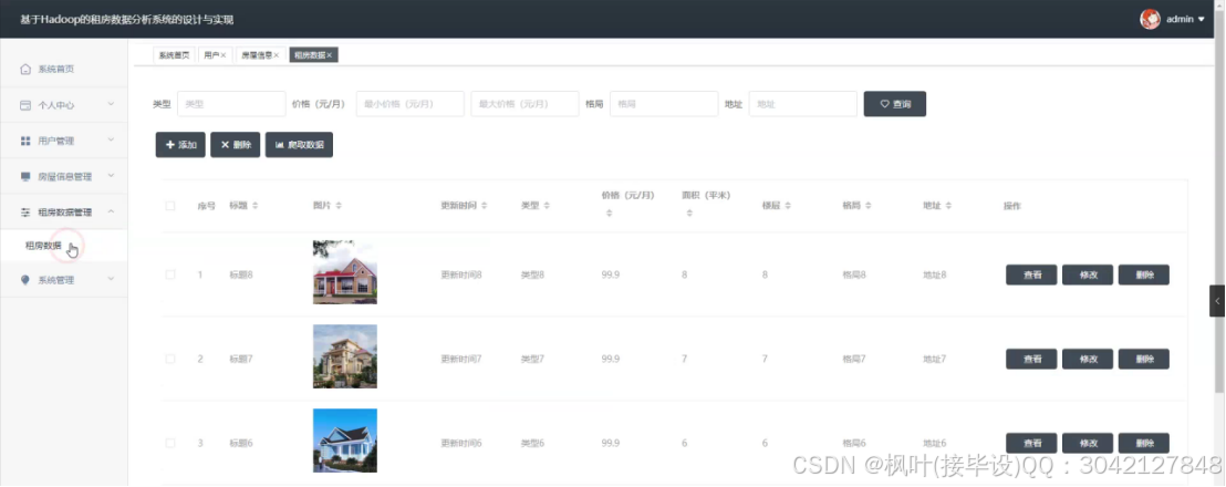 租房数据分析系统是一个基于Hadoop的大数据平台,通过采用B/S架构,Django框架以及MySQL数据库技术,旨在为用户提供全面的租房信息和数据支持。该系统具备丰富的功能,包括管理员端的系统首页、个人中心、用户管理、房屋信息管理、租房数据管理和系统管理,以及前台端的首页、房屋信息、租房数据、房屋资讯和个人中心等模块。通过这些功能,用户可以方便地查找合适的房源,了解租金走势和热门区域等信息,同时管理员可以对用户和房屋信息进行有效管理,保证系统的正常运行和数据的安全性。该系统利用Hadoop技术处理和分析大量租房数据,为用户提供准确的市场分析和决策参考,帮助用户更好地了解租房市场的情况。无论是对于房东、租客还是房产中介来说,租房数据分析系统都是一个不可或缺的工具,为租房市场的健康发展提供了有力支持