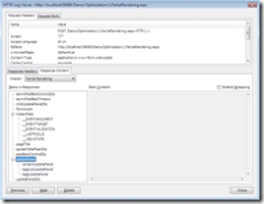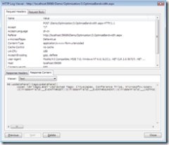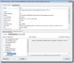 andre:这里还有一些比较有趣的事情,我想展示一下刚才发生了什么。我们依旧回到刚才的“response content”,这就是从服务器端发回的内容,但是我们在这里使用“partial rendering”视图(上图)。这里发生的事情是,有个updatepanel被更新了,在每次请求之后,我们会更新所有的3个updatepanel,我们在这里使用updatepanel的默认设置,updatemode为always。这样,无论向服务器端请求的内容是什么,所有的updatepanel都会同时进行刷新。这里的问题就在于,我们可能不需要重新生成所有的updatepanel,我们需要的是简单地选择几个需要更新的updatepanel。这里就使用到updatepanel的一个属性,就是“conditional rendering”——噢,对不起,是“updatemode”。让我来告诉您我到底在说什么(~/optimization/3.optimizebandwidth.aspx)。