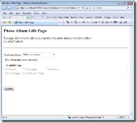 andre:这里的想法就是,我们不让每次checkbox被选中或取消时就发送一次请求,我们只在我们准备好的情况下发送数据。我们再看一下页面(老赵:这里的截图就省略了),当我们选中一个像册时会发送一个请求。每次但我们点击checkbox时,我们不会给服务器端发送数据。不过当我们点击update按钮时,一个请求就出现了。这里的关键就在于,即使我们能够很快地与服务器端交互,我们也要仔细考虑一下,我们是否真的必要把autoposkback打开,让控件自动地与服务器端交互,因为这意味着页面上所有的数据将向服务器端进行一个来回。