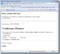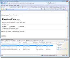 andre:我先从展示没有updatepanel时的体验开始(~/optimization/0.simpleform.aspx)。这是个简单的页面(上图左,请注意back按钮无法使用),我们有几个相册供用户选择,然后我们将为它们添加tag。现在我们没有使用updatepanel,当选择了某一项时,您会发现发生了一个完整的页面刷新(上图中,我把back按钮可以使用了)。因为现在在我的本地机器上演示,因此这个刷新非常迅速。但是在互联网上就不会像本地那么快了,带宽会非常小。您可以发现,当我点击页面上每个单选按钮后,页面都会有完整的刷新(上图右,back按钮的列表多了几项)。