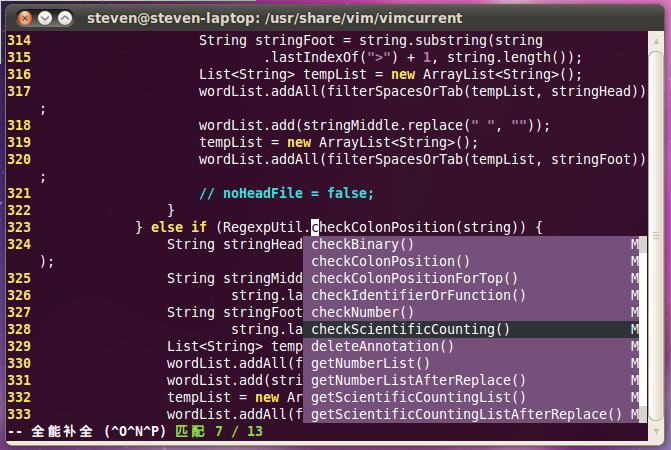 效果虽然不如 myeclipse改进版的自动补全那么强大,不过好歹也是超轻量级的东西,按ctrl+x ,ctrl+o,可显示补全菜单。