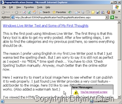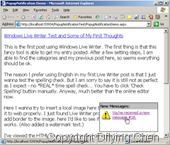 今天上午抽时间作了一个,以asp.net ajax control toolkit extender的形式发布。限于http协议的局限性,只能采取客户端pull的方法,每隔一段时间查询一下某个web service,如果有新消息,则在客户端以动画形式显示出来。如下面两张图,左边的刚刚显示一半,右边已经完整显示了出来(点击查看大图):