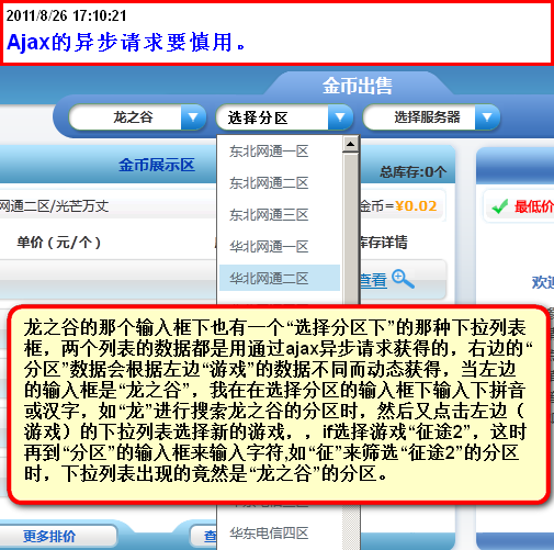 第二步:我又去在左边的下拉列表里选择了游戏”征途2“,然后在选择游戏分区的输入框里输入”t”,筛选征途2的游戏分区里包含“t”的游戏分区,可是就在这个时候第一步里向后台请求“龙之谷”游戏的经过筛选后的分区数据来了,于是在游戏列表显示,然后马上“征途2”游戏分区的数据也从服务器返回来了,于是就追加在龙之谷的分区数据的上面了。