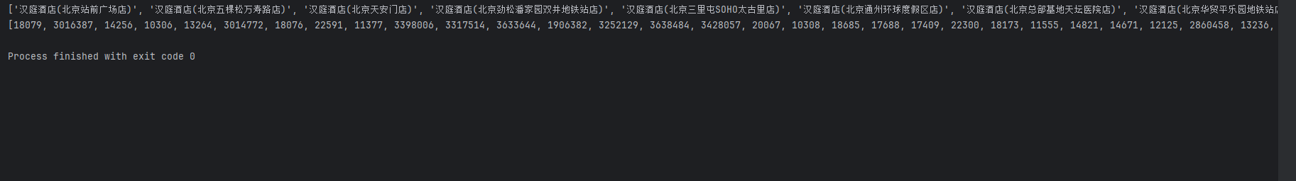 1.运行上述代码结果如下,两个列表分别是搜索出来的酒店的名称和id列表: