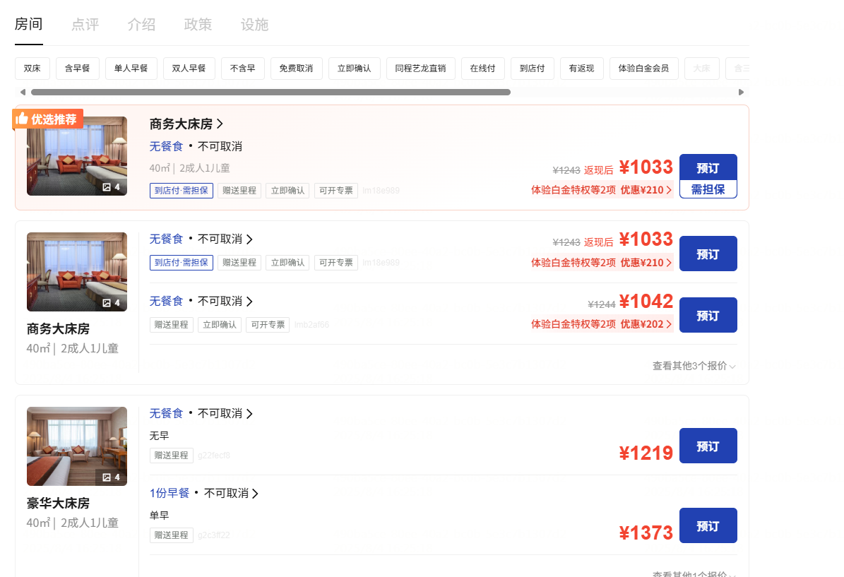 1.点击酒店跳转到详情页面,可以看到不同房间套餐的信息。