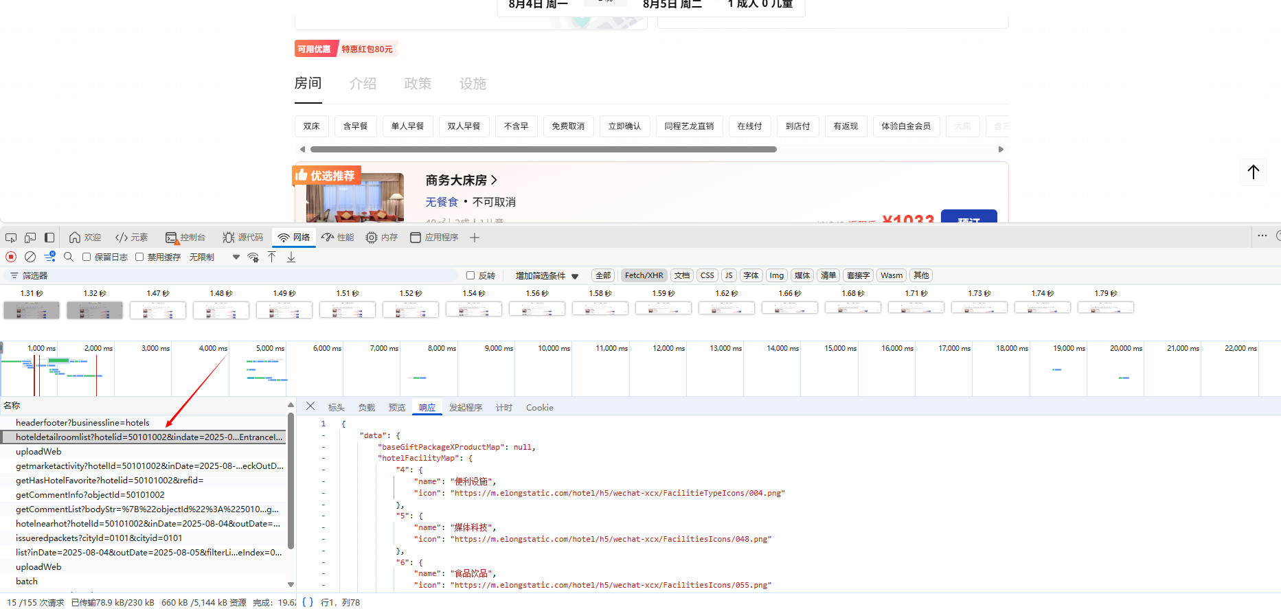 2.查看网络请求可以发现调用了一个叫hoteldetailroomlist接口拿到的房间数据。