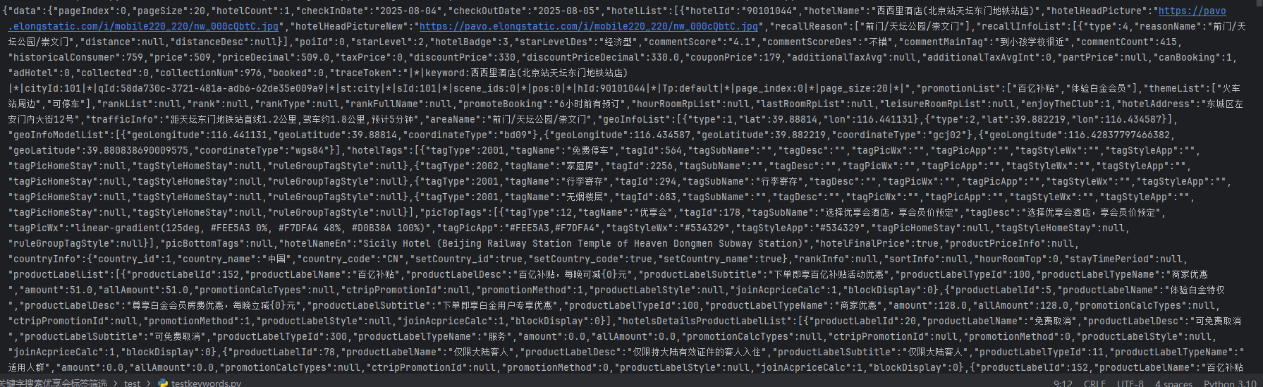 3.那我们需要实现在本地去请求这个接口拿到酒店数据,使用Python requests库实现,可以看到如下代码中携带了很多入参,这些参数都是必须的(我已经筛选过了),SessionToken为登录后的账号凭证,无法在本地模拟生成,只能手动去页面复制出来。