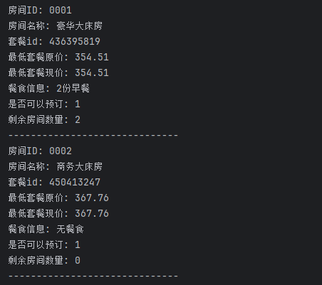 4.运行结果如下,我这里取出了房间价格等数据,还需要其他数据的话可以自行分析response结构进去拿取: