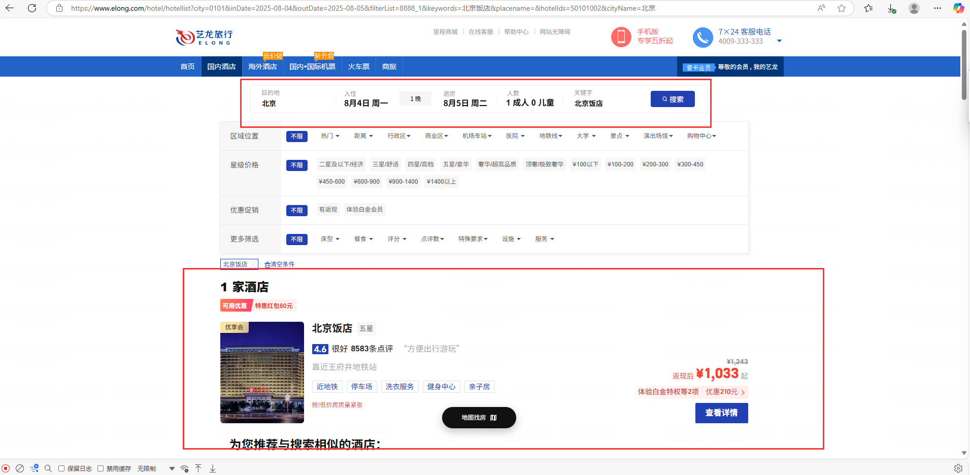 1.艺龙酒店搜索界面如图所示,输入城市名称、日期、酒店关键字等数据后即可搜索相关酒店。