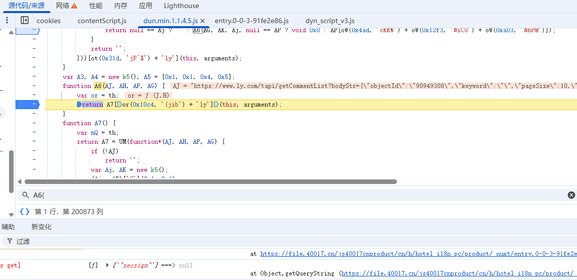同程旅行中有多个接口用到了user-dun参数,这里我以hoteldetailroomlist接口为例,找到参数加密入口如下(A6方法):