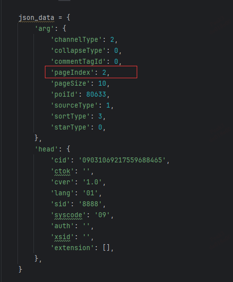 6.那有聪明的小伙伴又问了,主播主播,这怎么就10个评论呀,因为一个页面就只有10条数据啊,想要爬取其他页的数据可以修改请求入参,也就是json_data,json_data中有个参数叫pageIndex参数,可选范围是1~300,也就是说一个景区你能爬3000条评论数据。