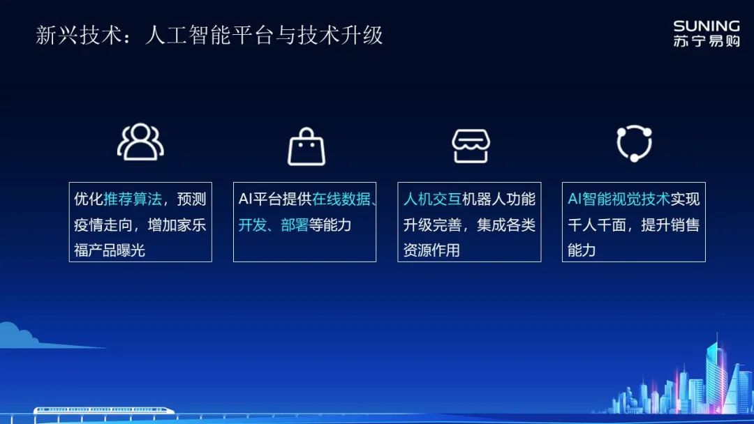 在新兴技术上,布局人工智能平台和技术升级。例如在疫情期间,通过优化推荐算法预测疫情走向,及时高效的增加家乐福产品曝光。升级还包括,通过AI平台,提供在线数据应用、开发和部署等能力;使人机交互机器人功能升级完善,集成各类资源作用;通过AI智能视觉技术,实现“千人千面”,更好理解消费者,推荐合 适商品,提升销售能力等。