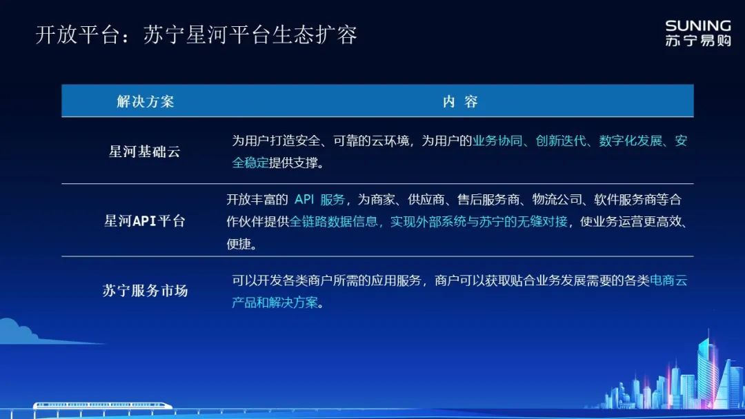 在开放平台,实现苏宁星河平台的生态扩容。解决方案包含:在星河基础云上,为用户打造安全可靠的云环境,支撑用户的业务协同、创新迭代、数字化发展和安全稳定;在星河API平台,开放丰富的 API 服务,为商家、供应商、售后服务商、物流公司、软件服务商等合作伙伴提供全链路数据信息,实现外部系统与苏宁的无缝对接,使业务运营更高效、便捷;在苏宁服务市场,开发各类商户所需的应用服务,商户可获贴合业务发展的电商云产品和解决方案。