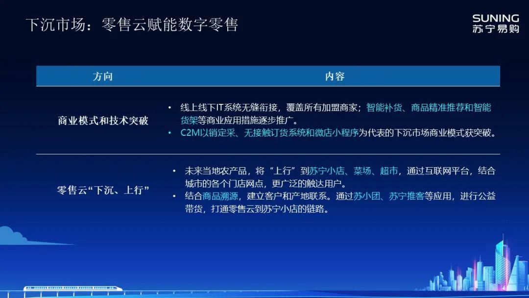 王俊杰提到:在下沉市场,苏宁推出了零售云,为三四线以下城市的加盟商户和有志青年,提供全新的创业机会,他们将获得商业和技术上的全面赋能。同时,推动 C2M模式以销代产,加盟商户可以直接实现无接触订货。除了下行,零售云还通过“上行”计划,让区域特色的农产品等,加入苏宁小店和苏宁菜场,通过互联网 平台销售,使产品更广泛触达消费者。