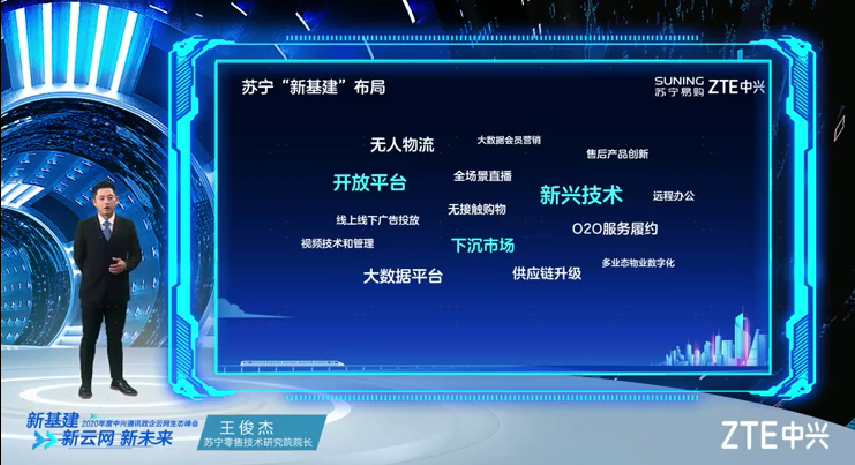 苏宁零售技术研究院院长王俊杰,发表《新基建引领新变革,创造智慧零售新生态》主题演讲,深入剖析当前形势下零售行业的处境,以及未来发展的新方向,并从数字化场景端口、服务化零售渠道和广泛深度互联三方面,分享了苏宁30年零售经验与5G应用实践成果。