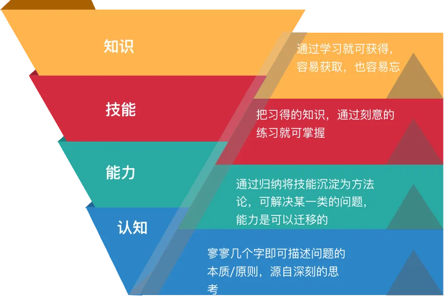为了系统性地理解技术人员的成长路径,我们可以构建一个四层模型。这四层分别是“知识(Knowledge)”、“技能(Skill)”、“能力(Capability)”和“认知(Cognition)”。它们层层递进,共同构成了我们职业价值的完整体系。