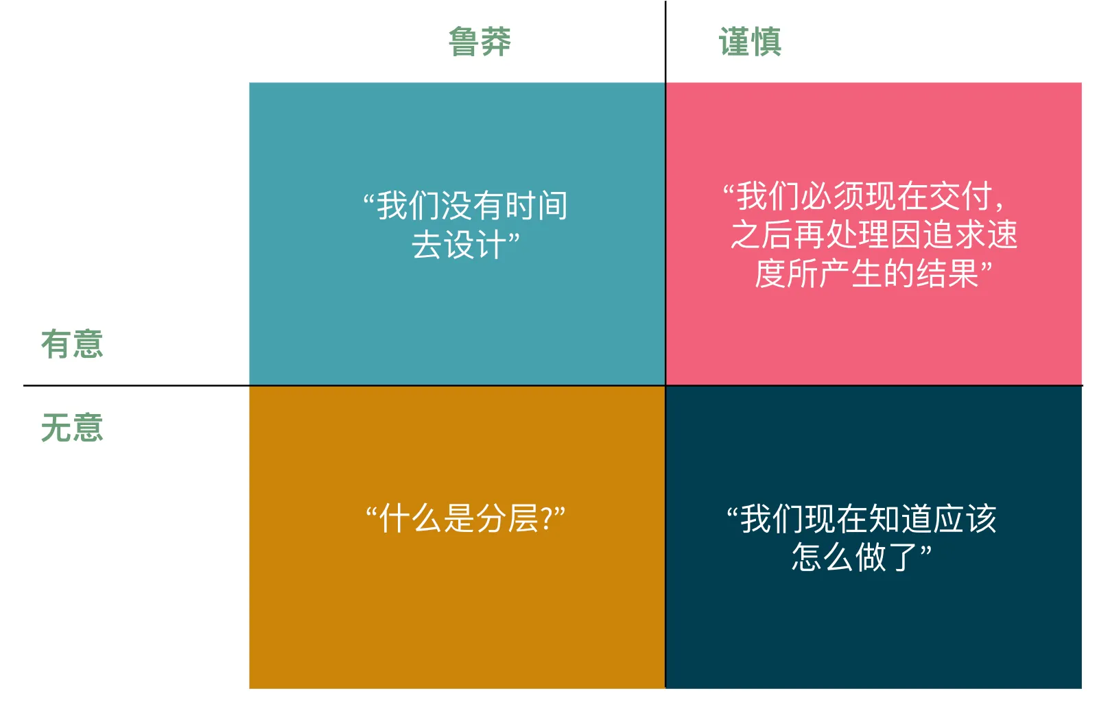 鲁莽且无意的债:这是最糟糕的一种,源于团队的能力不足或疏忽。“我不知道有更好的方法,所以就这么写了。” 这不是战略选择,而是工程事故。