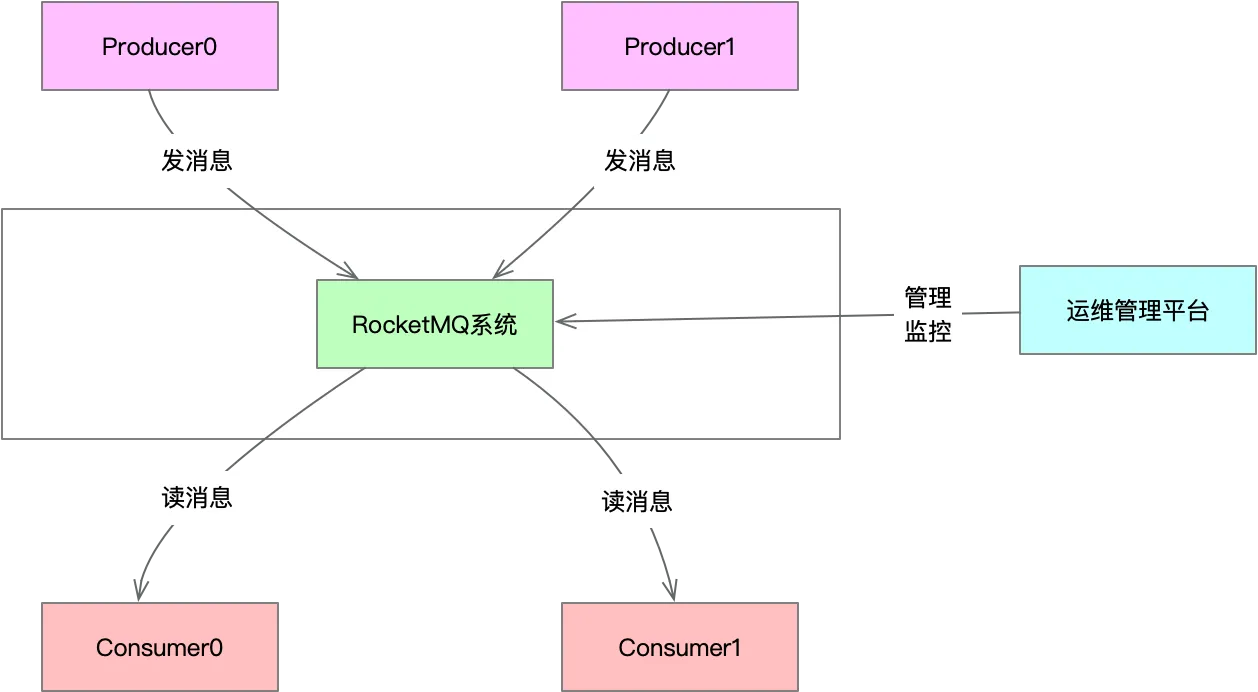 在这个最宏观的视图里,我们将整个RocketMQ系统看作一个单独的、中心的黑盒。围绕着它,有三类核心的“外部用户”或“外部系统”在与之交互: