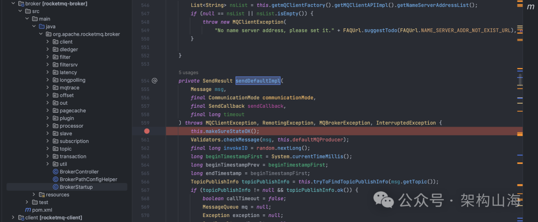 我们成功地启动了核心集群,发送了第一条消息,并且精准地找到了探索消息发送之旅的入口——sendDefaultImpl方法。