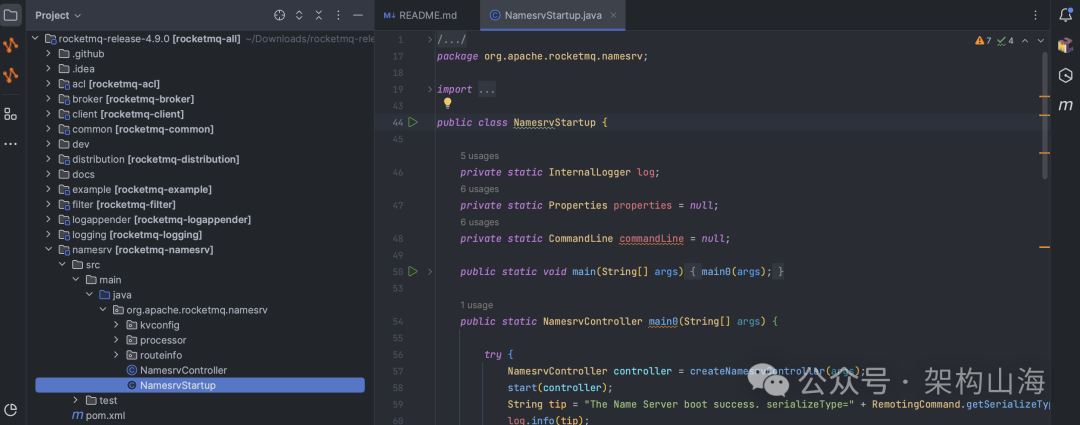 namesrv模块,找到启动类:org.apache.rocketmq.namesrv.NamesrvStartup.java。