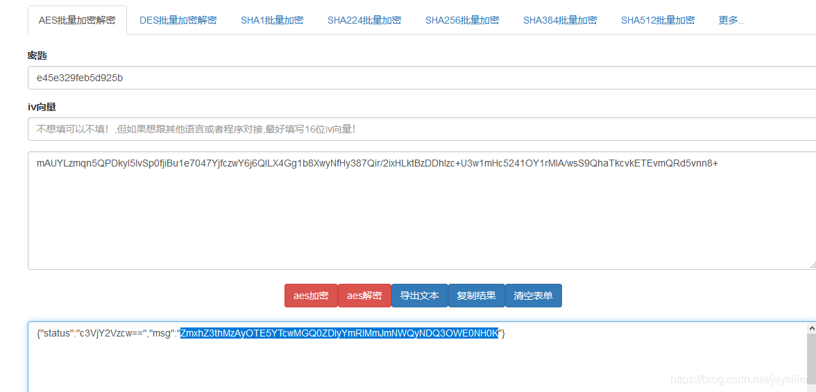 用里面的默认key,对刚才流量中选中的部分做AES解码,可以得到下面那串东西:{"status":"c3VjY2Vzcw==","msg":"ZmxhZ3thMzAyOTE5YTcwMGQ0ZDIyYmRlMmJmNWQyNDQ3OWE0NH0K"}