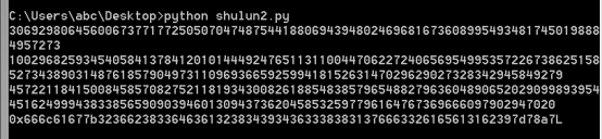 s = int('0x574c8185aca3caa5d3f3f40a534a8d9604cd3de6b2e6372c0131a843f34d2e245a328c1b6a69b5d65430d18d0fab941ebd93414f59be0a44b35daf3b4a1e8acc',16)