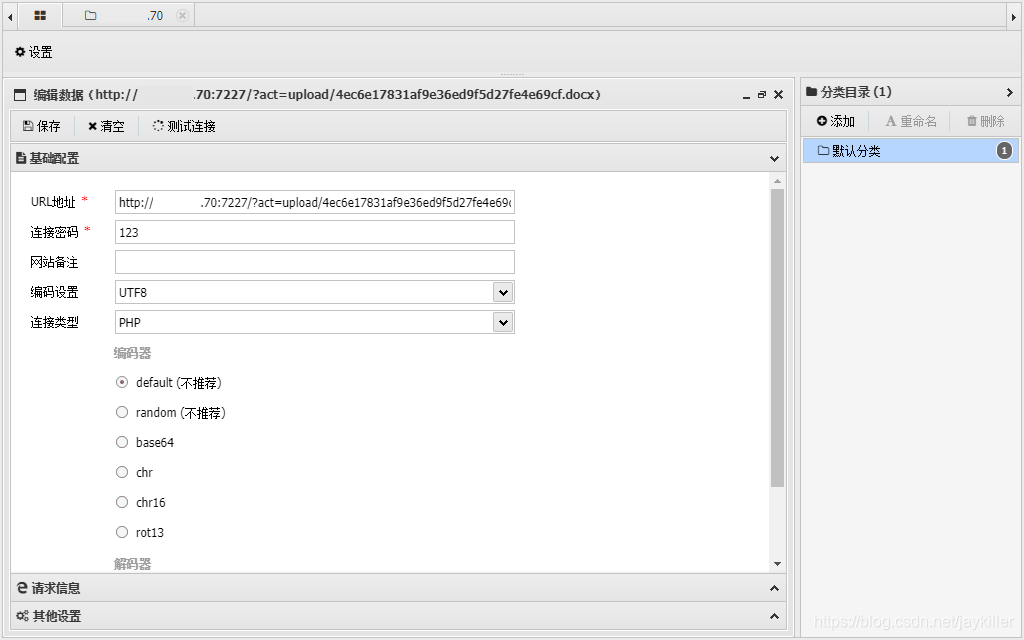 用蚁剑去连接,地址为/?act=<word上传的地址>。
