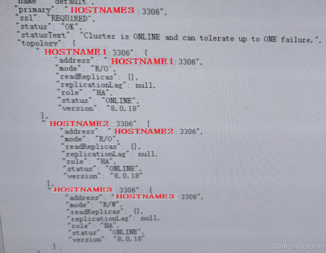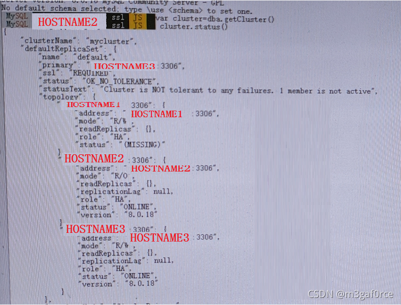 原本HOSTNAME1是ReadWrite,HOSTNAME2和HOSTNAME3是ReadOnly状态。目前来看,宕机的HOSTNAME1为R/W的Missing状态,而HOSTNAME3被选择成为了新的R/W角色。