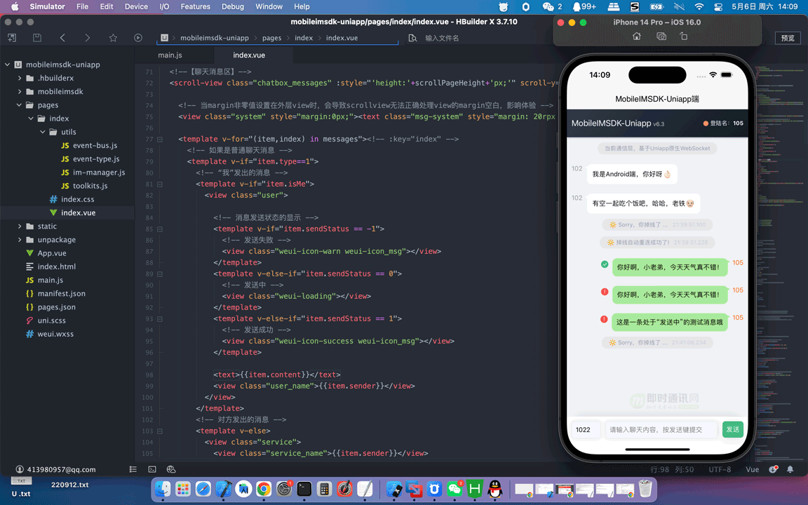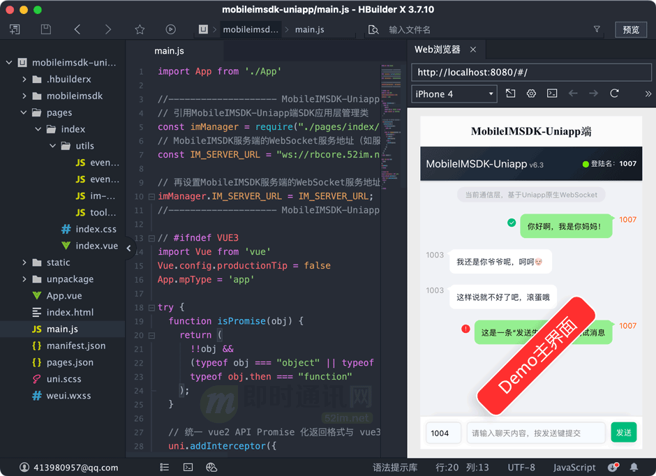 MobileIMSDK-Uniapp端是一套基于Uniapp跨端框架的即时通讯库: