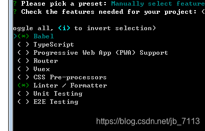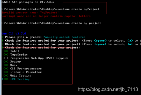 然后创建项目:vue create my_project;选择第二个(Manually select features),下箭头,回车