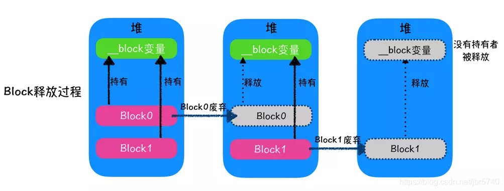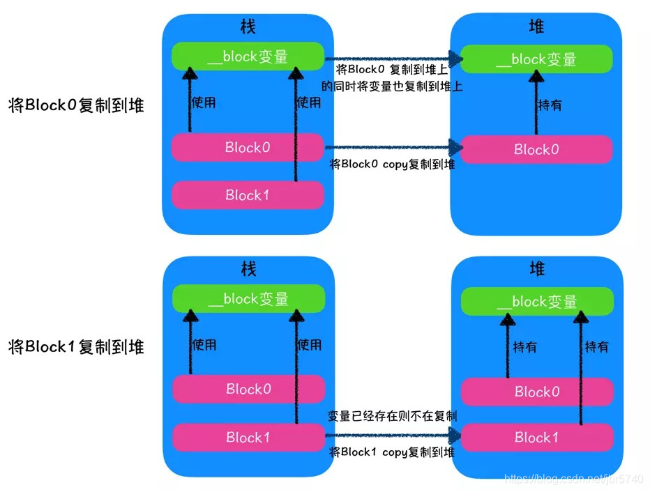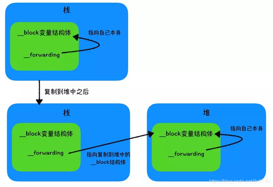 - 当block在堆上时,__Block_byref_var_0也会复制一份到堆上,此时栈上的__forwarding将不再指向自己,而是指向了堆上的__forwarding,堆上的__forwarding则是指向自己!!