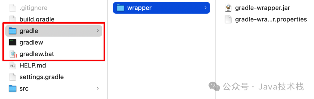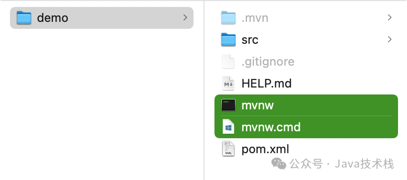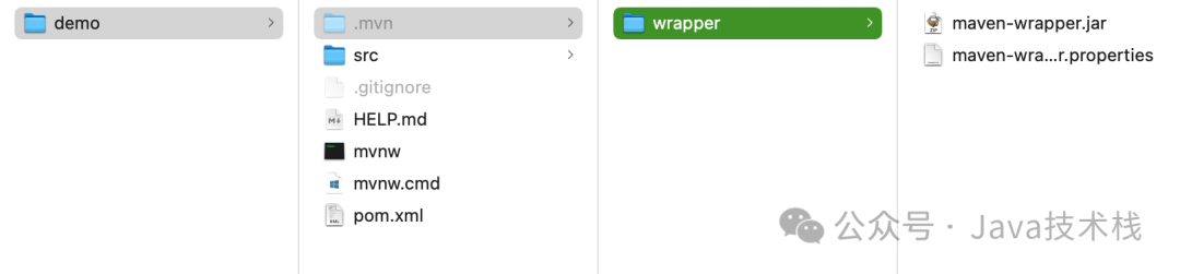 除了上面所说的 mvnw 脚本,在当前目录下会初始化一个 .mvn/wrapper 目录: