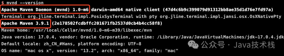 mvnd 和传统的 Maven 使用方式一样,前缀改用 mvnd 即可,后面的选项都是一样的,比如,安装完后,可以使用下面命令验证版本: