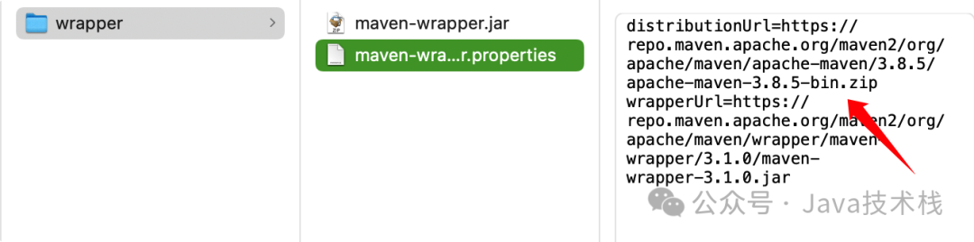 如果 Maven Wrapper 使用的并不是最新的版本,想使用最新的 Maven 3.8.5,可以在 maven-wrapper.properties配置文件中指定版本: