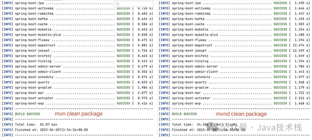 这个开源学习项目有很多个模块,打包还挺费时的,来对比下两者的构建速度: